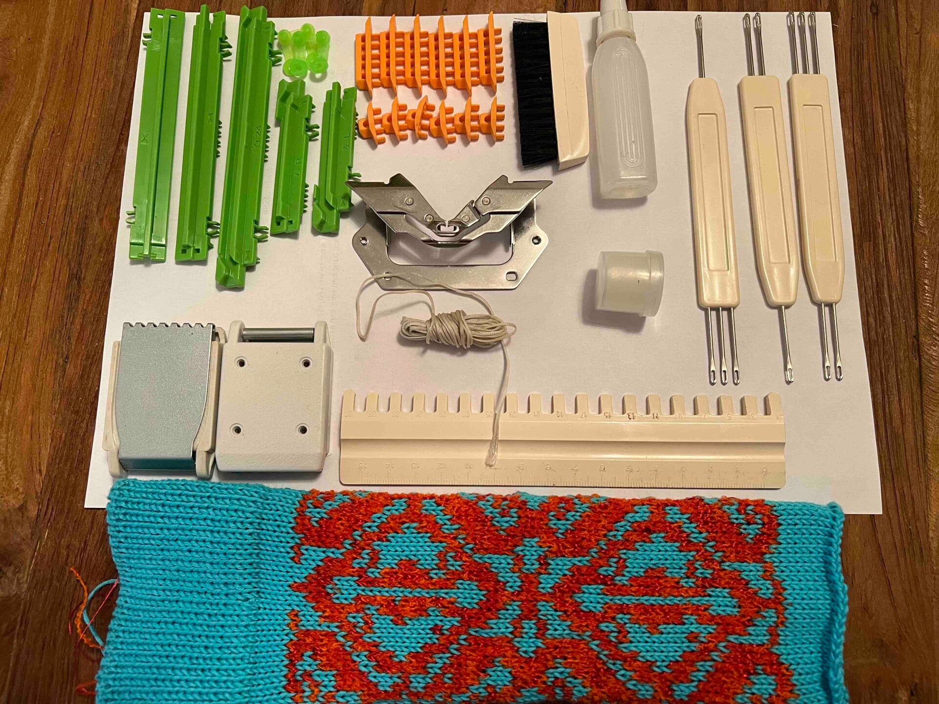 Die Brother KH860 ist eine Feinstrickmaschine mit Lochkarten, 4,5 mm Nadelabstand und 200 Nadeln. Sie verwendet Lochkarten zur automatischen Musterauswahl bis zu einer Maschenbreite von 24 und eignet sich für eine Vielzahl von Stricktechniken.